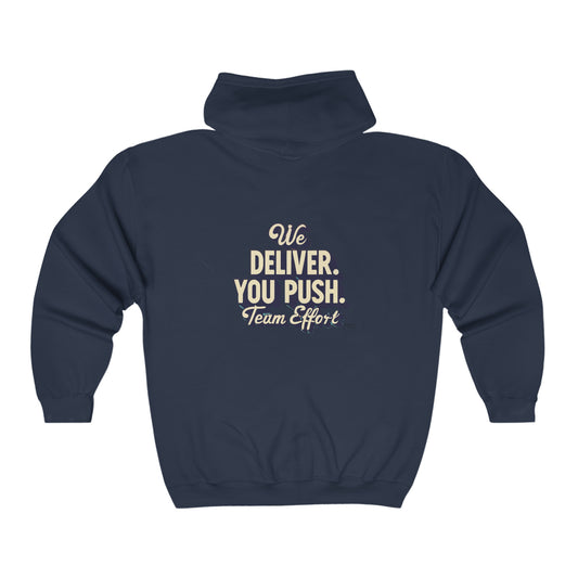 "We Deliver, You Push. Team Effort" Unisex Full Zip Hooded Sweatshirt